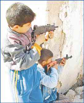كانت الأسلحة كافية تماما لتلبية رغبات الصغار في تقليد حماقات الكبار, ومحاكاة ميولهم العدوانية, وتجسيد نواياهم الشريرة, وملائمة تماما لإعادة تمثيل أفلام الأكشن, والرسوم المتحركة القائمة على فكرة النسف والتدمير وإزهاق الأرواح, ومسلسلات العنف والترويع, التي تعرضها الفضائيات العربية ليل نهار, والعاب الكومبيوتر والأتاري, وهكذا تراكمت الممارسات العدوانية, وتعمقت في أذهان الأطفال, فحفزتهم على تقمص ادوار رامبو, والرجل الوطواط, والرجل العنكبوت, وجاكي شان, ومراد علم دار, وفان دام.